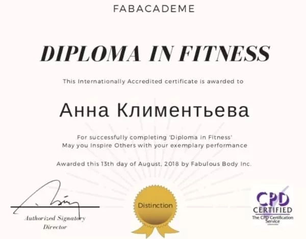 "Диплома по фитнесу" международного образца "Fabulous Body" Inc.