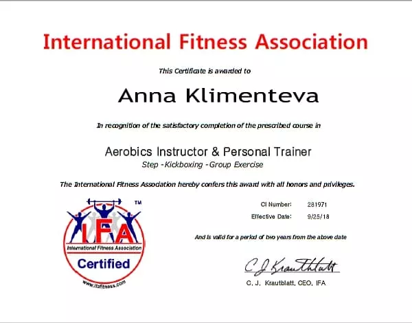 Сертификат "IFA" "Инструктор по фитнесу и персональный тренер".